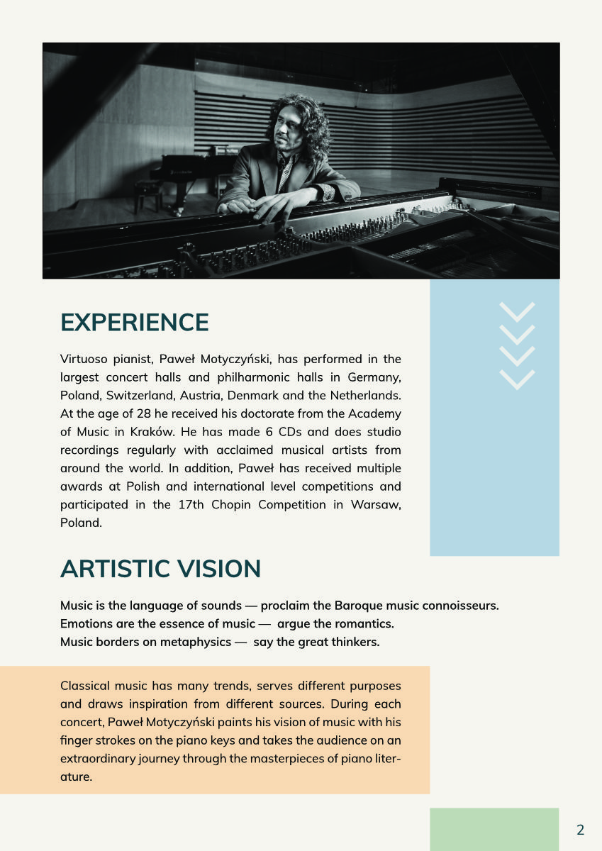 Dr. Paweł Motyczyński performs regularly with renown orchestras in outstanding concert halls in Germany, Poland, Switzerland, Austria, Denmark and the Netherlands. He obtained his doctorate of arts at the Academy of Music in Krakow, Poland from the Chopin specialist Prof. Miroslaw Herbowski. Paweł is a laureate of international piano competitions in Rome, Kraków and Budapest, and participated in the 17th International Chopin Piano Competition in Warsaw.