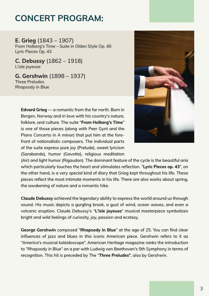 My specialties: Classical, film or popular piano music. Organizing concerts. Adding splendor to your event via being a part of a larger event or by performing a full piano recital at your event.